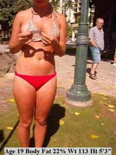 Tatianna had been doing strenuous weight work and aerobics while restricting calories and could not eliminate her excess body fat, here shown at 23%. She was told to stop doing aerobics and limit weight work to very light weights and short routines. She had no fatigue, hunger, moodiness or anxiety on the "Lean Gene Diet." |